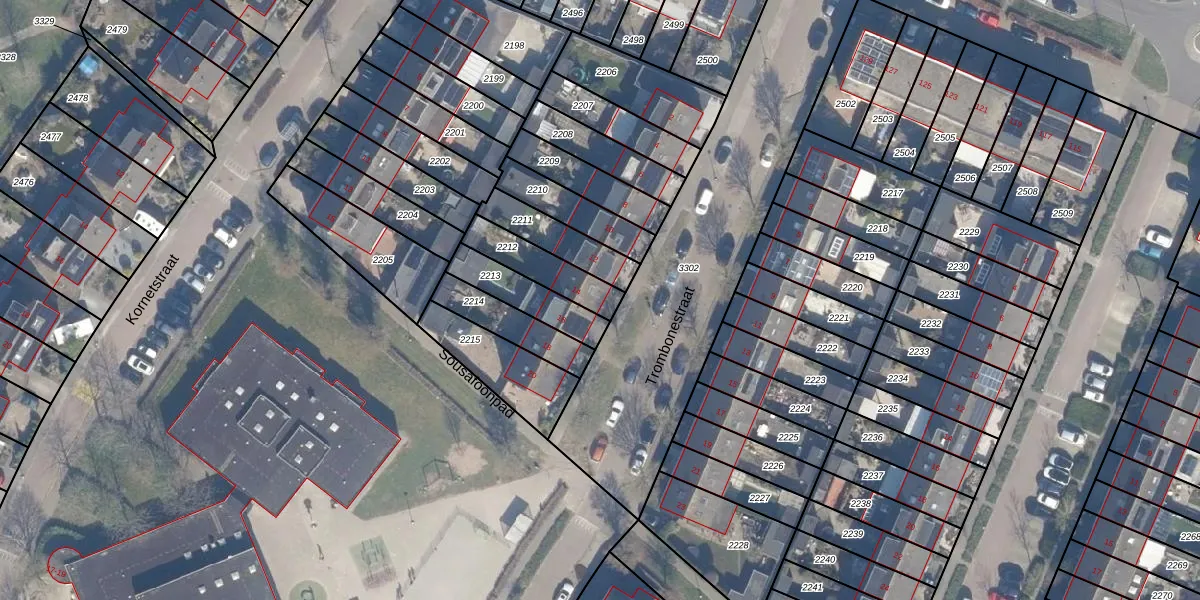 Het perceel waarop Trombonestraat 14 staat heeft een oppervlakte van 153 m². Dit is een middelgroot perceel. De perceeloppervlakte wordt geregistreerd door het Kadaster. Gedetailleerde informatie over de maten van dit perceel kunt u vinden in het rapport Kadastrale kaart met maatvoering van Trombonestraat 14.