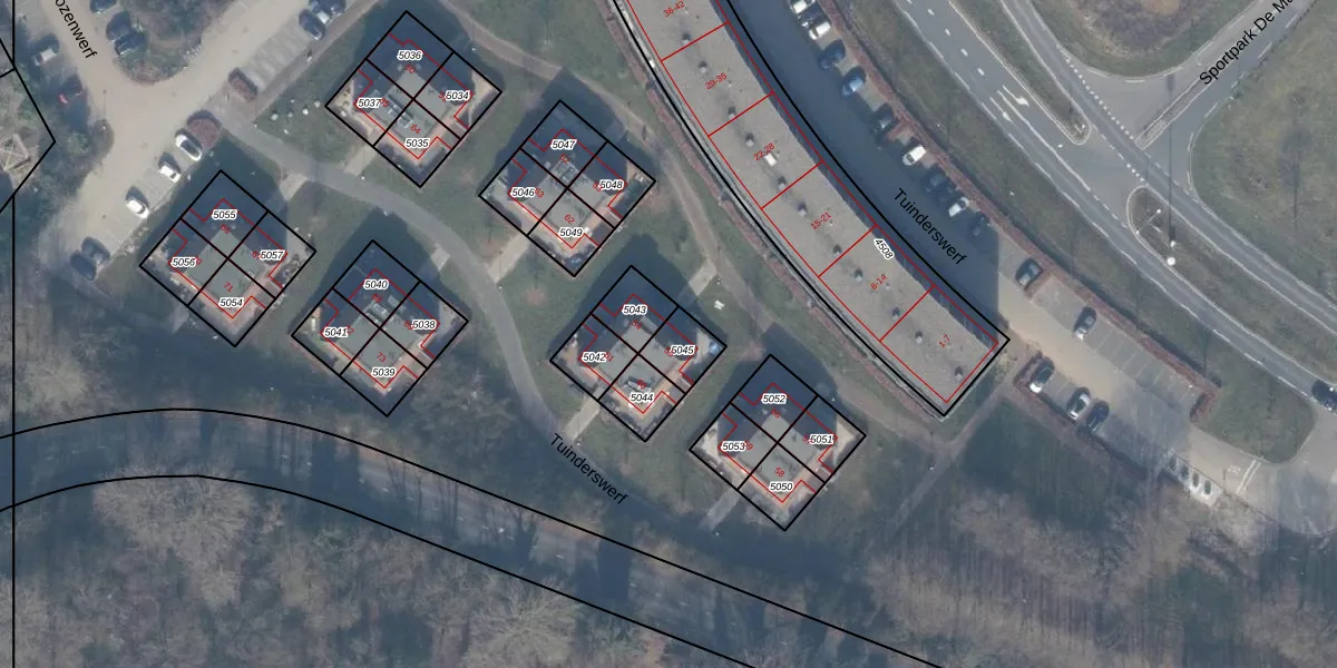 Het perceel waarop Tuinderswerf 55 staat heeft een oppervlakte van 87 m². Dit is een klein perceel. De perceeloppervlakte wordt geregistreerd door het Kadaster. Gedetailleerde informatie over de maten van dit perceel kunt u vinden in het rapport Kadastrale kaart met maatvoering van Tuinderswerf 55.
