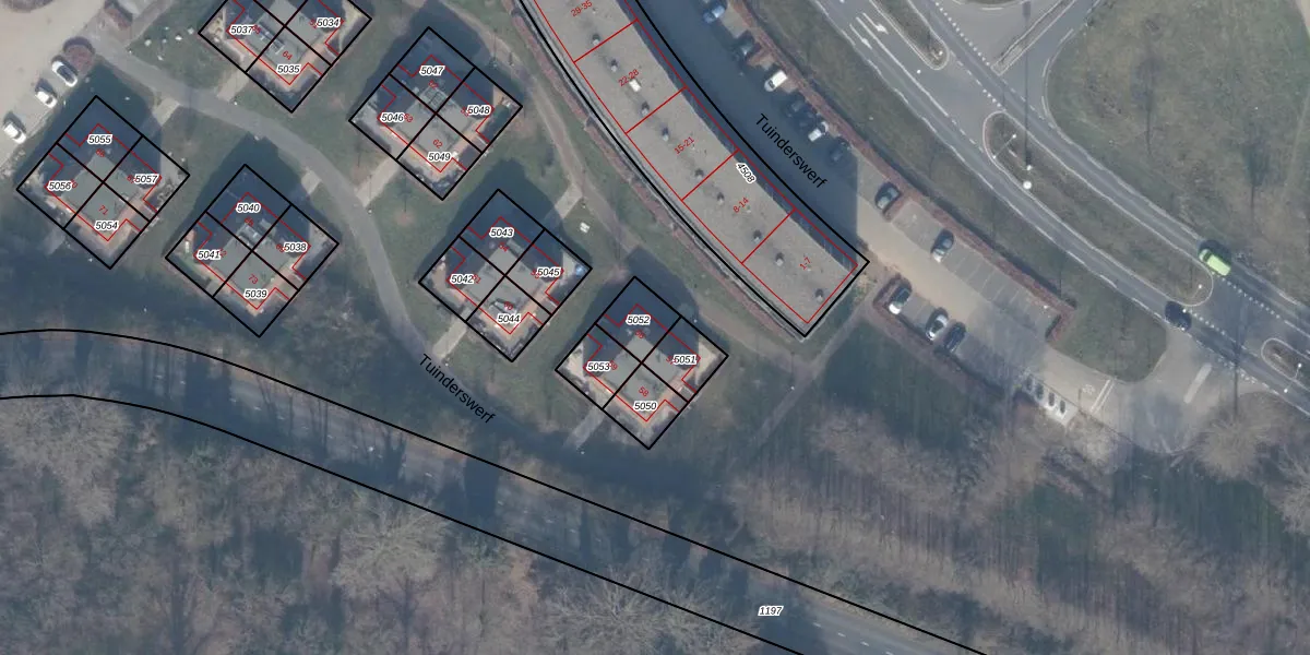 Het perceel waarop Tuinderswerf 56 staat heeft een oppervlakte van 87 m². Dit is een klein perceel. De perceeloppervlakte wordt geregistreerd door het Kadaster. Gedetailleerde informatie over de maten van dit perceel kunt u vinden in het rapport Kadastrale kaart met maatvoering van Tuinderswerf 56.