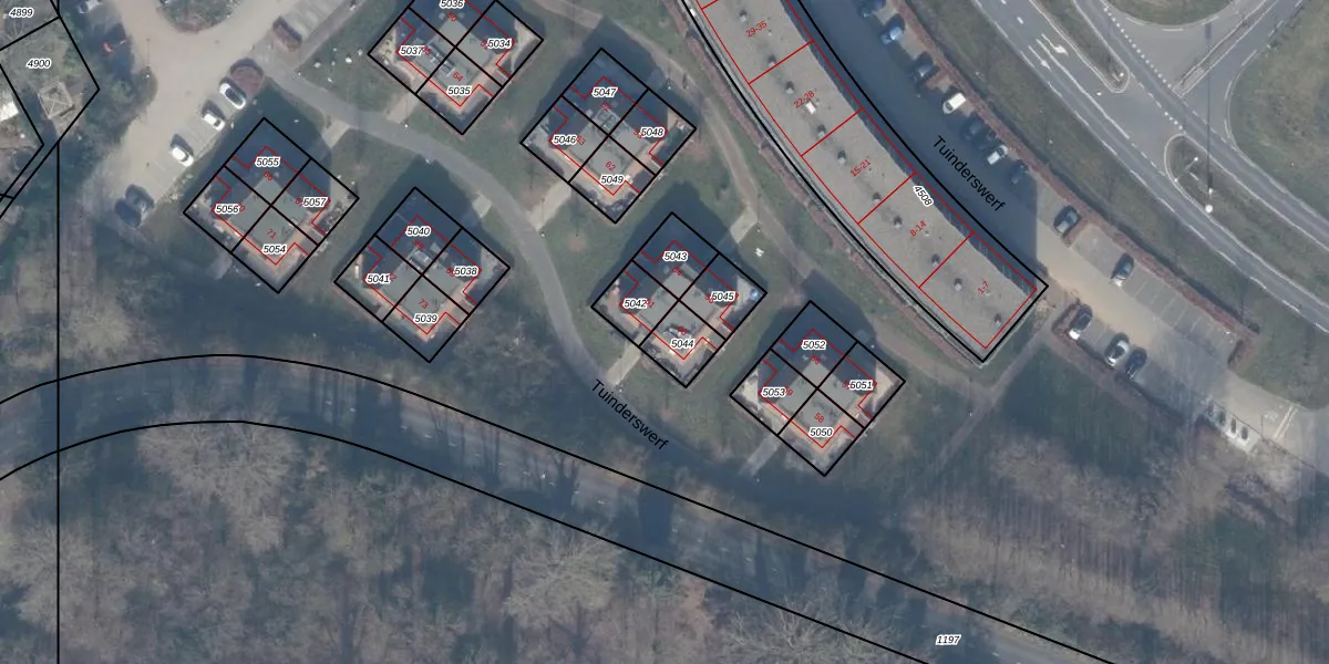 Het perceel waarop Tuinderswerf 60 staat heeft een oppervlakte van 87 m². Dit is een klein perceel. De perceeloppervlakte wordt geregistreerd door het Kadaster. Gedetailleerde informatie over de maten van dit perceel kunt u vinden in het rapport Kadastrale kaart met maatvoering van Tuinderswerf 60.