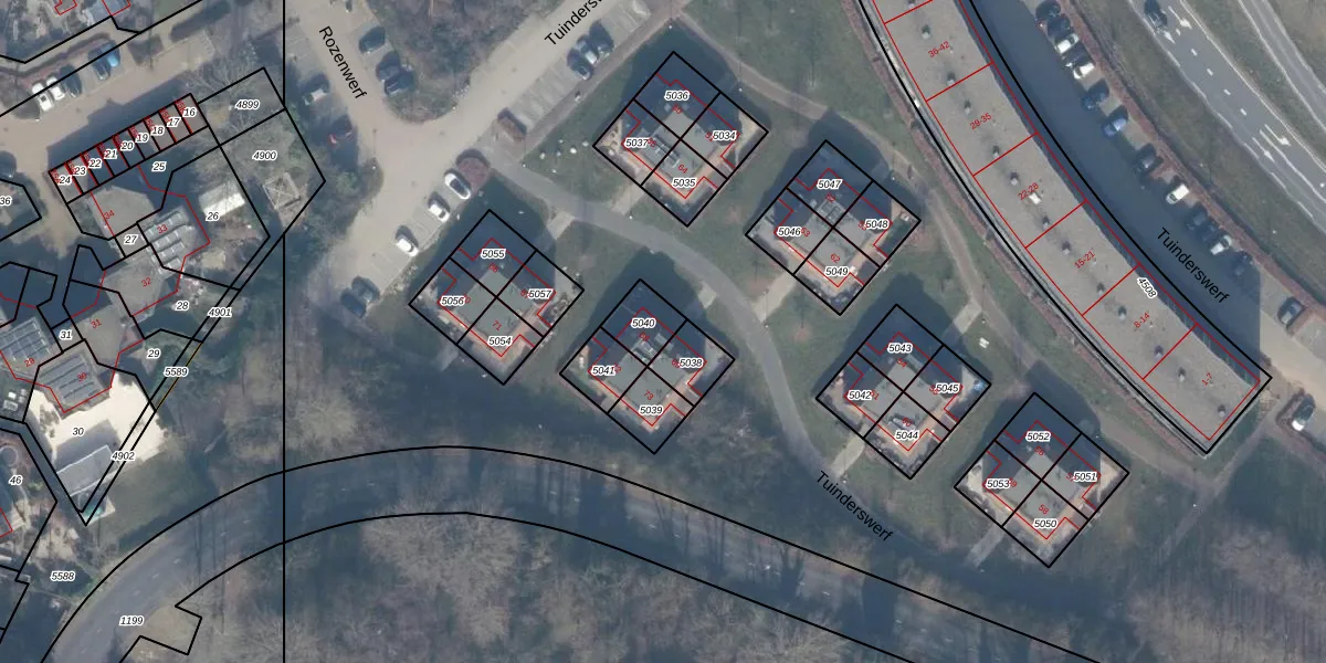 Het perceel waarop Tuinderswerf 68 staat heeft een oppervlakte van 87 m². Dit is een klein perceel. De perceeloppervlakte wordt geregistreerd door het Kadaster. Gedetailleerde informatie over de maten van dit perceel kunt u vinden in het rapport Kadastrale kaart met maatvoering van Tuinderswerf 68.