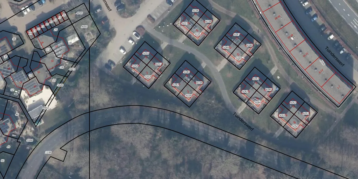 Het perceel waarop Tuinderswerf 72 staat heeft een oppervlakte van 87 m². Dit is een klein perceel. De perceeloppervlakte wordt geregistreerd door het Kadaster. Gedetailleerde informatie over de maten van dit perceel kunt u vinden in het rapport Kadastrale kaart met maatvoering van Tuinderswerf 72.
