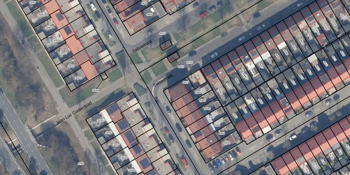 Het adres is gelegen op perceel 6977 in de sectie U en de kadastrale gemeente Almere. De kadastrale aanduiding is aldus AMR04-U-6977. Het perceel is kleiner dan gemiddeld in Almere. Het perceel is 132 m² groot, terwijl het gemiddelde ligt op 3327,62 m². Het grootste perceel in de kadastrale gemeente is 32,12 km². Het kleinste perceel heeft een oppervlakte van 0 m². Op het perceel zijn 4 adressen aanwezig. In de Basisregistratie Kadaster (BRK) werden de grenzen van het perceel geregistreerd op 28-10-2024.