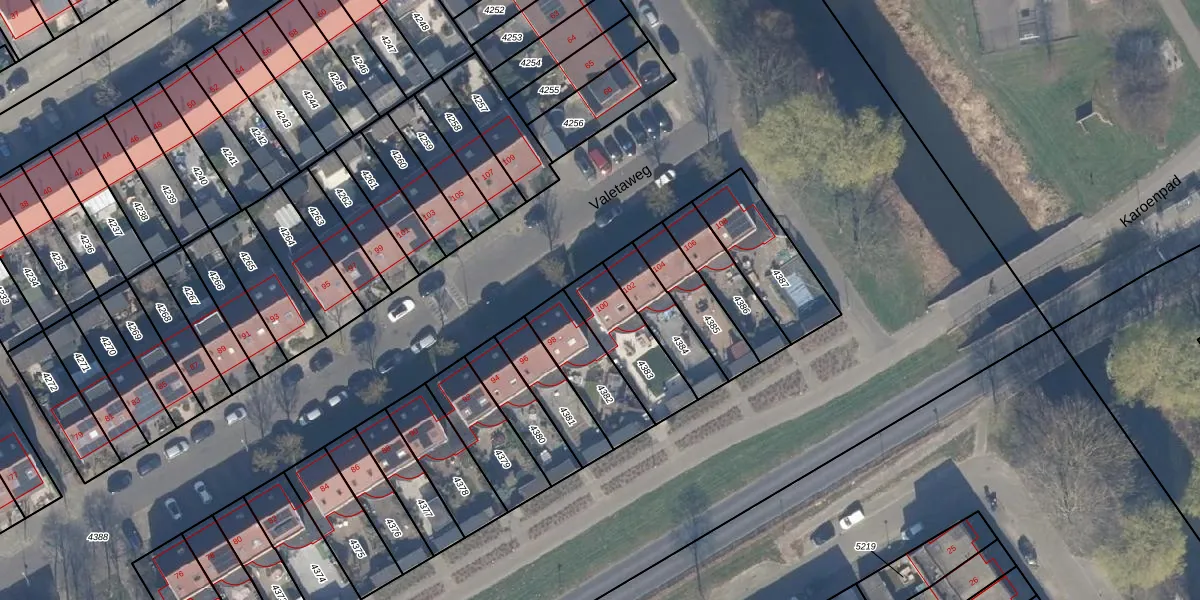 Valetaweg 100 is gelegen op kadastraal perceel AMR04U4383. Deze kadastrale aanduiding is uniek en wordt gebruikt door het Kadaster om eigendomsrechten en andere zakelijke rechten vast te leggen. Het perceel maakt onderdeel uit van de kadastrale gemeente Almere.