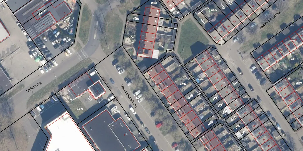 Het perceel waarop Verfmolenstraat 1 staat heeft een oppervlakte van 658 m². Dit is een groot perceel. De perceeloppervlakte wordt geregistreerd door het Kadaster. Gedetailleerde informatie over de maten van dit perceel kunt u vinden in het rapport Kadastrale kaart met maatvoering van Verfmolenstraat 1.