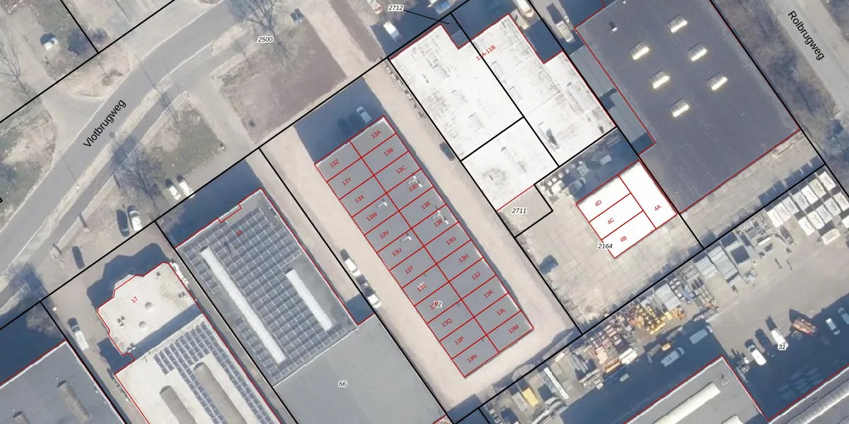 Het perceel waarop Vlotbrugweg 13-E staat heeft een oppervlakte van 2960 m². Dit is een zeer groot perceel. De perceeloppervlakte wordt geregistreerd door het Kadaster. Gedetailleerde informatie over de maten van dit perceel kunt u vinden in het rapport Kadastrale kaart met maatvoering van Vlotbrugweg 13-E.