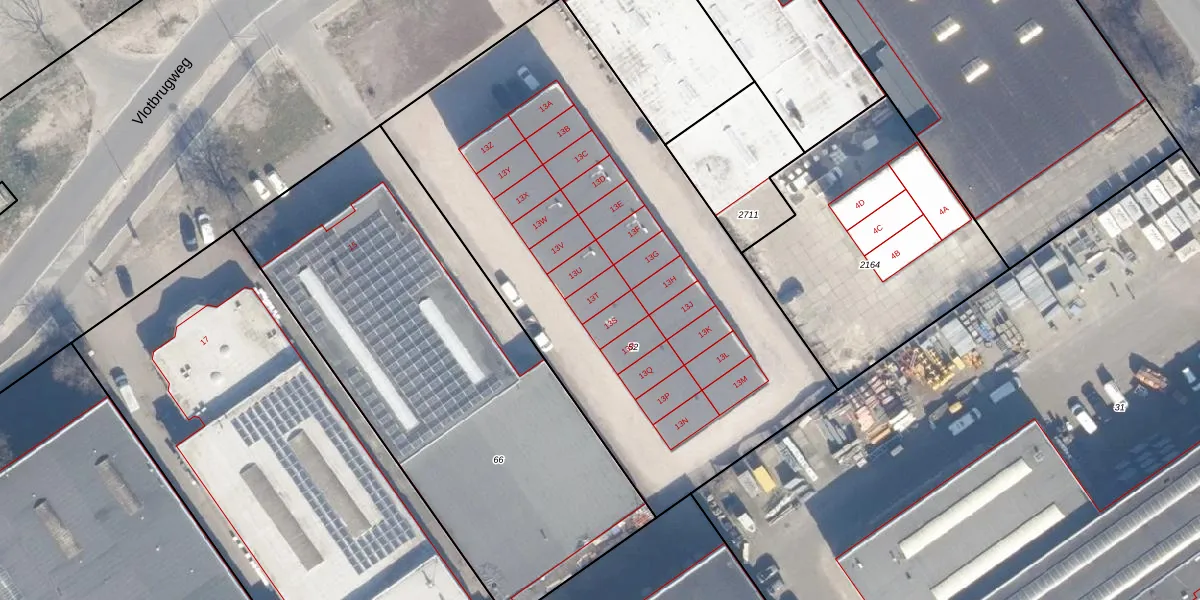 Het perceel waarop Vlotbrugweg 13-T staat heeft een oppervlakte van 2960 m². Dit is een zeer groot perceel. De perceeloppervlakte wordt geregistreerd door het Kadaster. Gedetailleerde informatie over de maten van dit perceel kunt u vinden in het rapport Kadastrale kaart met maatvoering van Vlotbrugweg 13-T.