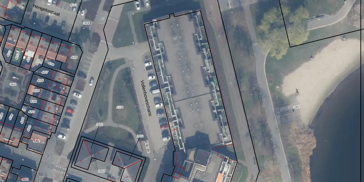Het perceel waarop Vollenhoveschans 43 staat heeft een oppervlakte van 8079 m². Dit is een zeer groot perceel. De perceeloppervlakte wordt geregistreerd door het Kadaster. Gedetailleerde informatie over de maten van dit perceel kunt u vinden in het rapport Kadastrale kaart met maatvoering van Vollenhoveschans 43.