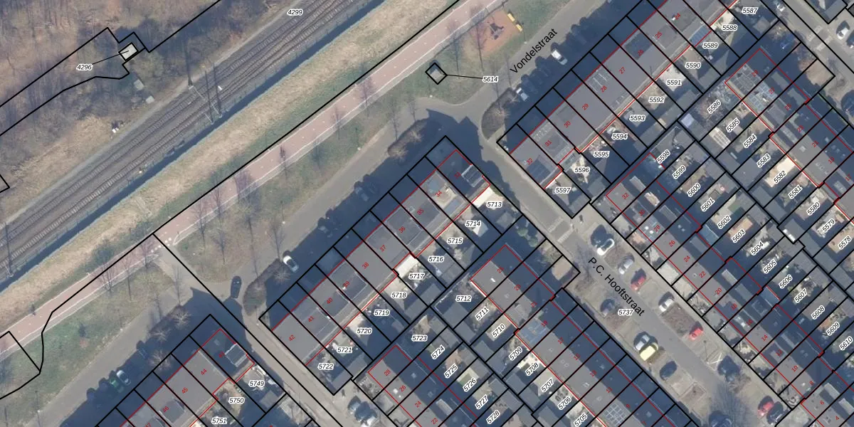 Het perceel waarop Vondelstraat 35 staat heeft een oppervlakte van 156 m². Dit is een middelgroot perceel. De perceeloppervlakte wordt geregistreerd door het Kadaster. Gedetailleerde informatie over de maten van dit perceel kunt u vinden in het rapport Kadastrale kaart met maatvoering van Vondelstraat 35.