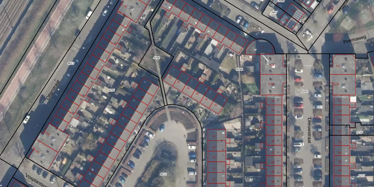 Het perceel waarop Vosplantsoen 28 staat heeft een oppervlakte van 6282 m². Dit is een zeer groot perceel. De perceeloppervlakte wordt geregistreerd door het Kadaster. Gedetailleerde informatie over de maten van dit perceel kunt u vinden in het rapport Kadastrale kaart met maatvoering van Vosplantsoen 28.