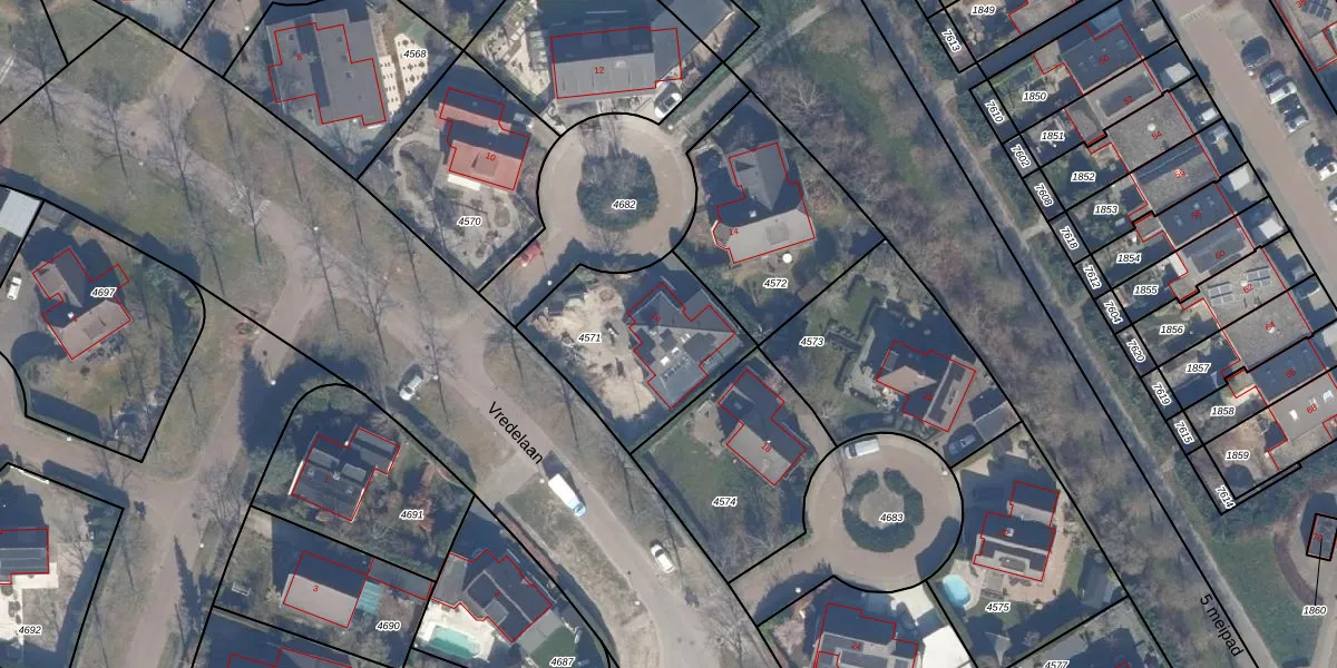 Het perceel waarop Vredelaan 16 staat heeft een oppervlakte van 593 m². Dit is een groot perceel. De perceeloppervlakte wordt geregistreerd door het Kadaster. Gedetailleerde informatie over de maten van dit perceel kunt u vinden in het rapport Kadastrale kaart met maatvoering van Vredelaan 16.
