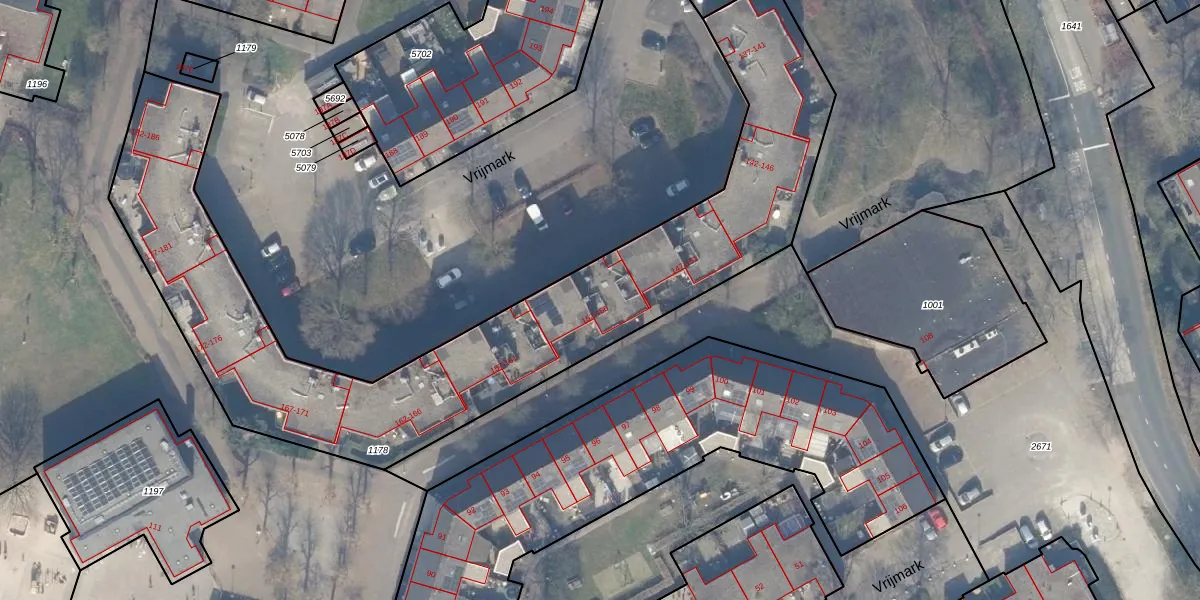 Het perceel waarop Vrijmark 153 staat heeft een oppervlakte van 2534 m². Dit is een zeer groot perceel. De perceeloppervlakte wordt geregistreerd door het Kadaster. Gedetailleerde informatie over de maten van dit perceel kunt u vinden in het rapport Kadastrale kaart met maatvoering van Vrijmark 153.