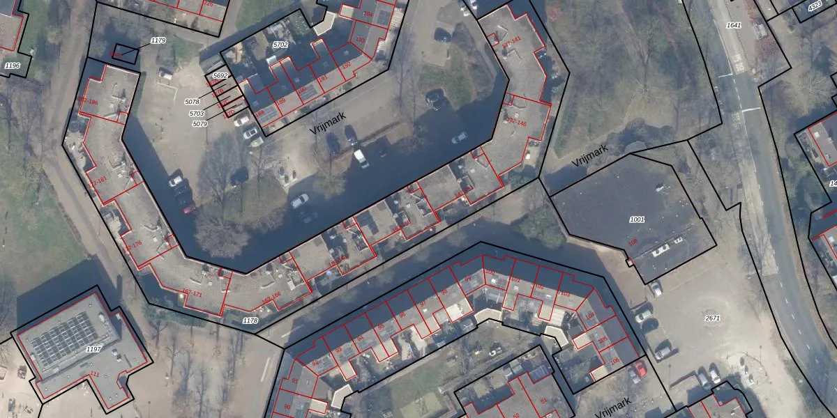 Het perceel waarop Vrijmark 154 staat heeft een oppervlakte van 2534 m². Dit is een zeer groot perceel. De perceeloppervlakte wordt geregistreerd door het Kadaster. Gedetailleerde informatie over de maten van dit perceel kunt u vinden in het rapport Kadastrale kaart met maatvoering van Vrijmark 154.