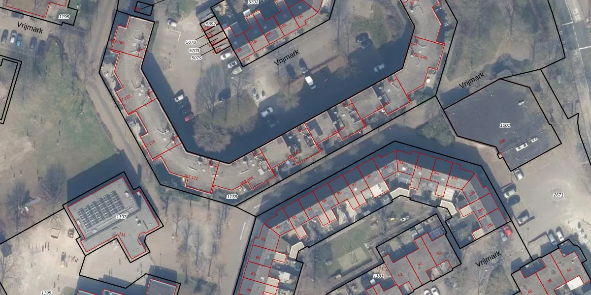 Het perceel waarop Vrijmark 158 staat heeft een oppervlakte van 2534 m². Dit is een zeer groot perceel. De perceeloppervlakte wordt geregistreerd door het Kadaster. Gedetailleerde informatie over de maten van dit perceel kunt u vinden in het rapport Kadastrale kaart met maatvoering van Vrijmark 158.