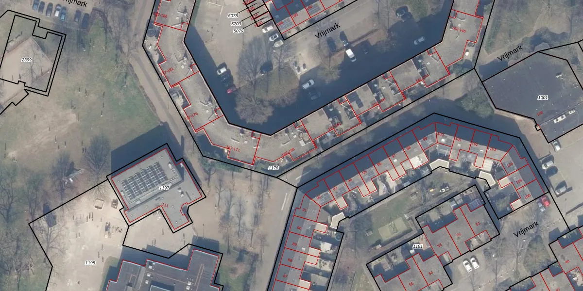 Het perceel waarop Vrijmark 163 staat heeft een oppervlakte van 2534 m². Dit is een zeer groot perceel. De perceeloppervlakte wordt geregistreerd door het Kadaster. Gedetailleerde informatie over de maten van dit perceel kunt u vinden in het rapport Kadastrale kaart met maatvoering van Vrijmark 163.