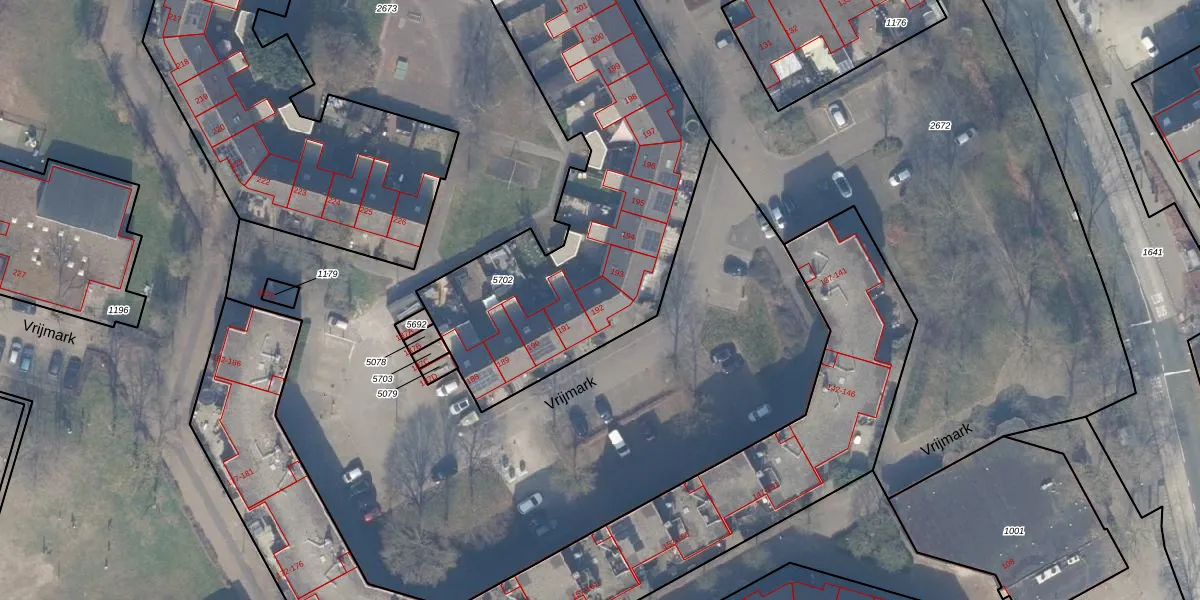 Het perceel waarop Vrijmark 192 staat heeft een oppervlakte van 4653 m². Dit is een zeer groot perceel. De perceeloppervlakte wordt geregistreerd door het Kadaster. Gedetailleerde informatie over de maten van dit perceel kunt u vinden in het rapport Kadastrale kaart met maatvoering van Vrijmark 192.