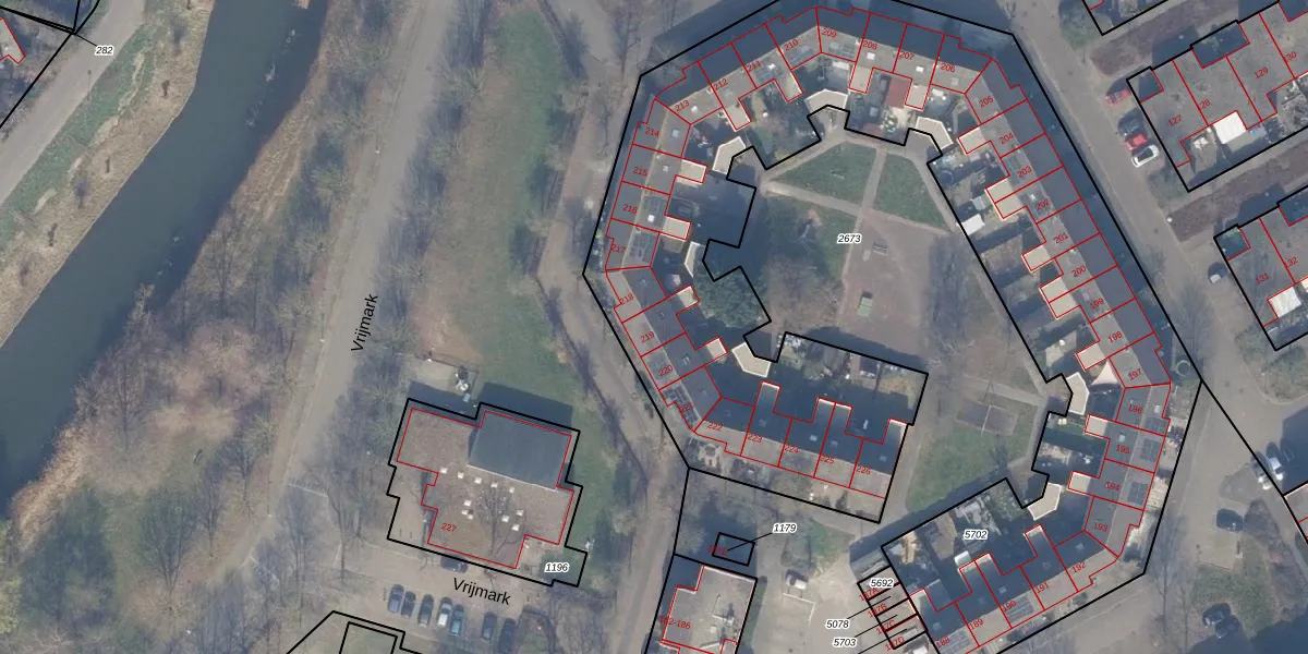 Het perceel waarop Vrijmark 219 staat heeft een oppervlakte van 4653 m². Dit is een zeer groot perceel. De perceeloppervlakte wordt geregistreerd door het Kadaster. Gedetailleerde informatie over de maten van dit perceel kunt u vinden in het rapport Kadastrale kaart met maatvoering van Vrijmark 219.