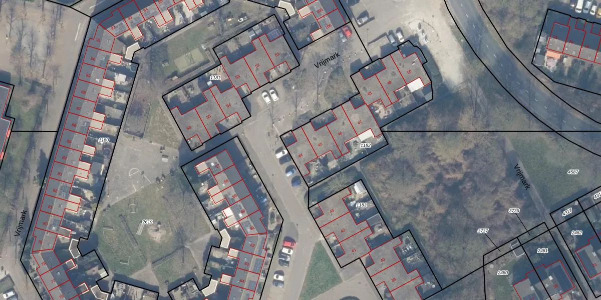 Het perceel waarop Vrijmark 44 staat heeft een oppervlakte van 1049 m². Dit is een zeer groot perceel. De perceeloppervlakte wordt geregistreerd door het Kadaster. Gedetailleerde informatie over de maten van dit perceel kunt u vinden in het rapport Kadastrale kaart met maatvoering van Vrijmark 44.