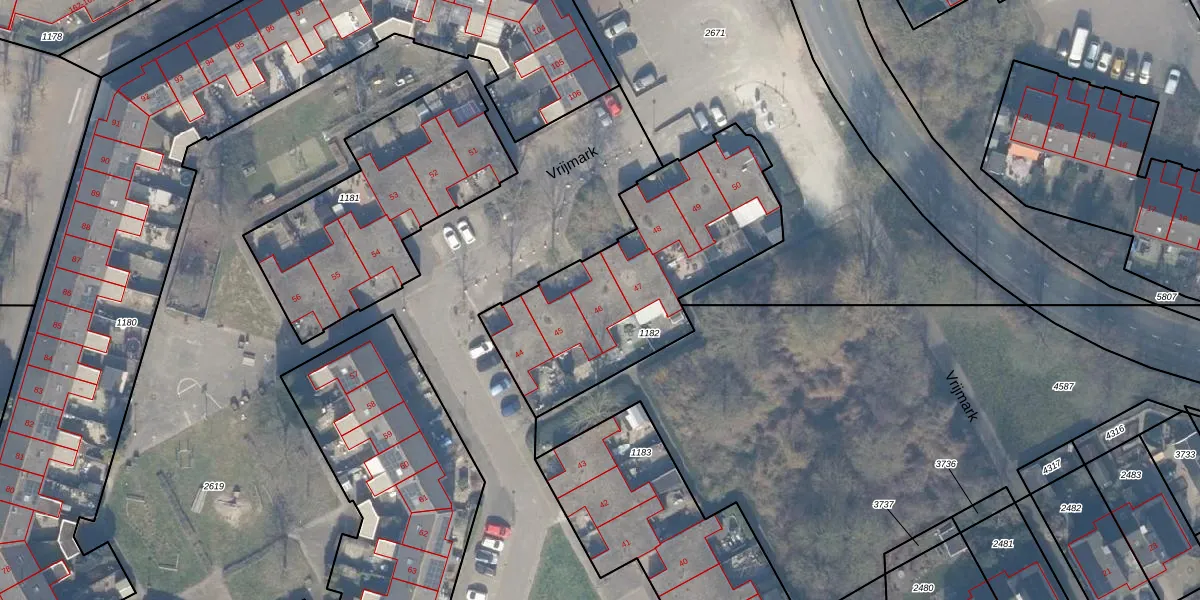 Het perceel waarop Vrijmark 46 staat heeft een oppervlakte van 1049 m². Dit is een zeer groot perceel. De perceeloppervlakte wordt geregistreerd door het Kadaster. Gedetailleerde informatie over de maten van dit perceel kunt u vinden in het rapport Kadastrale kaart met maatvoering van Vrijmark 46.