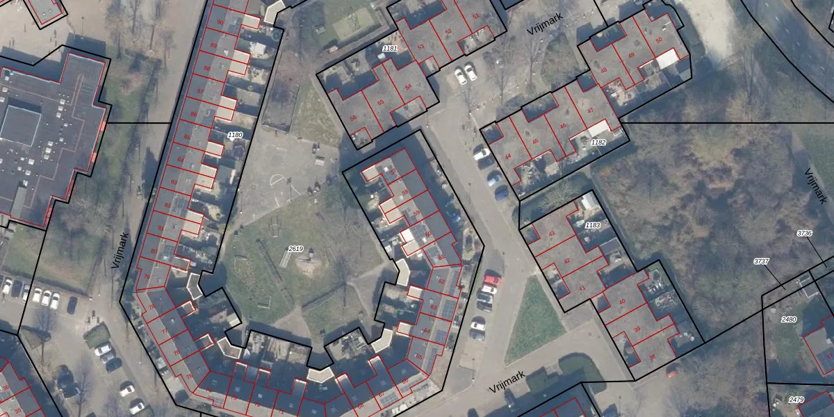 Het perceel waarop Vrijmark 59 staat heeft een oppervlakte van 5666 m². Dit is een zeer groot perceel. De perceeloppervlakte wordt geregistreerd door het Kadaster. Gedetailleerde informatie over de maten van dit perceel kunt u vinden in het rapport Kadastrale kaart met maatvoering van Vrijmark 59.