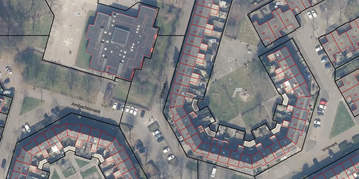 Het perceel waarop Vrijmark 80 staat heeft een oppervlakte van 5666 m². Dit is een zeer groot perceel. De perceeloppervlakte wordt geregistreerd door het Kadaster. Gedetailleerde informatie over de maten van dit perceel kunt u vinden in het rapport Kadastrale kaart met maatvoering van Vrijmark 80.