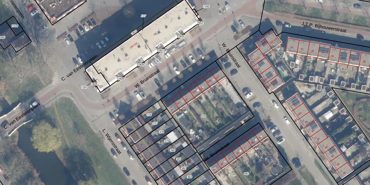 Het perceel waarop W. Bruinstraat 103 staat heeft een oppervlakte van 1325 m². Dit is een zeer groot perceel. De perceeloppervlakte wordt geregistreerd door het Kadaster. Gedetailleerde informatie over de maten van dit perceel kunt u vinden in het rapport Kadastrale kaart met maatvoering van W. Bruinstraat 103.