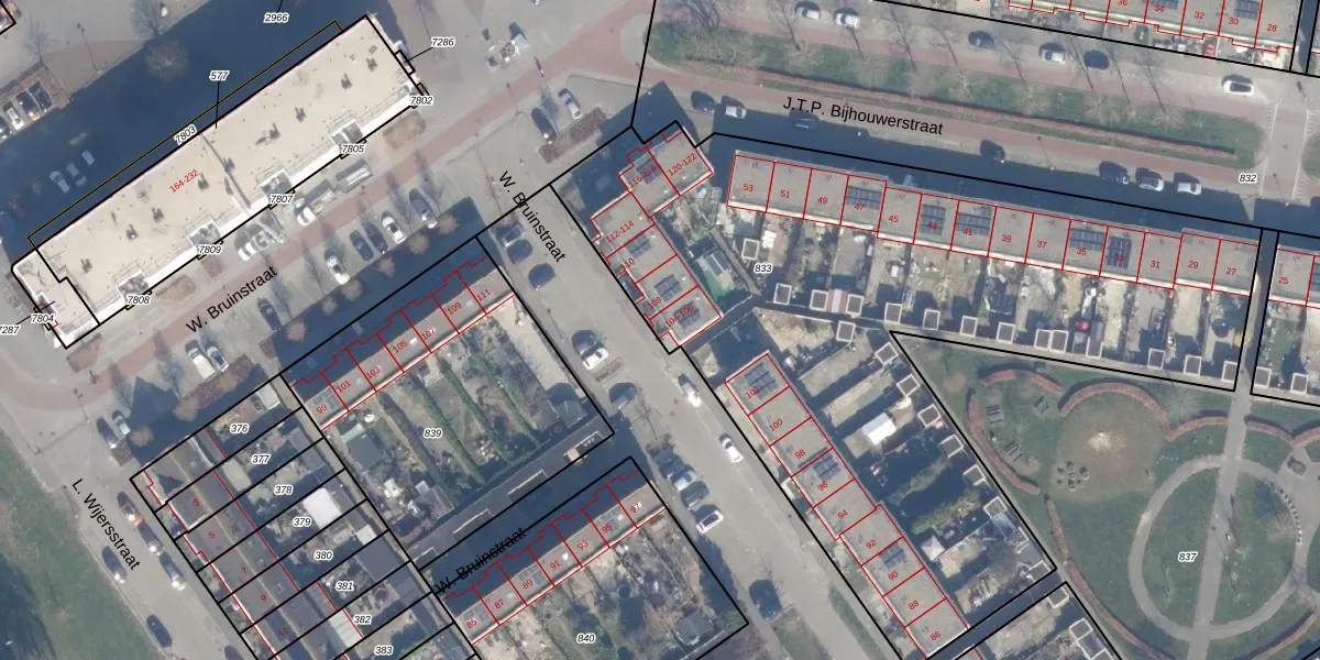 Het perceel waarop W. Bruinstraat 104 staat heeft een oppervlakte van 4110 m². Dit is een zeer groot perceel. De perceeloppervlakte wordt geregistreerd door het Kadaster. Gedetailleerde informatie over de maten van dit perceel kunt u vinden in het rapport Kadastrale kaart met maatvoering van W. Bruinstraat 104.