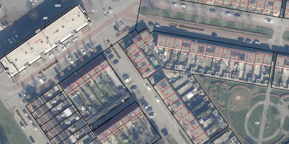 Het perceel waarop W. Bruinstraat 106 staat heeft een oppervlakte van 4110 m². Dit is een zeer groot perceel. De perceeloppervlakte wordt geregistreerd door het Kadaster. Gedetailleerde informatie over de maten van dit perceel kunt u vinden in het rapport Kadastrale kaart met maatvoering van W. Bruinstraat 106.