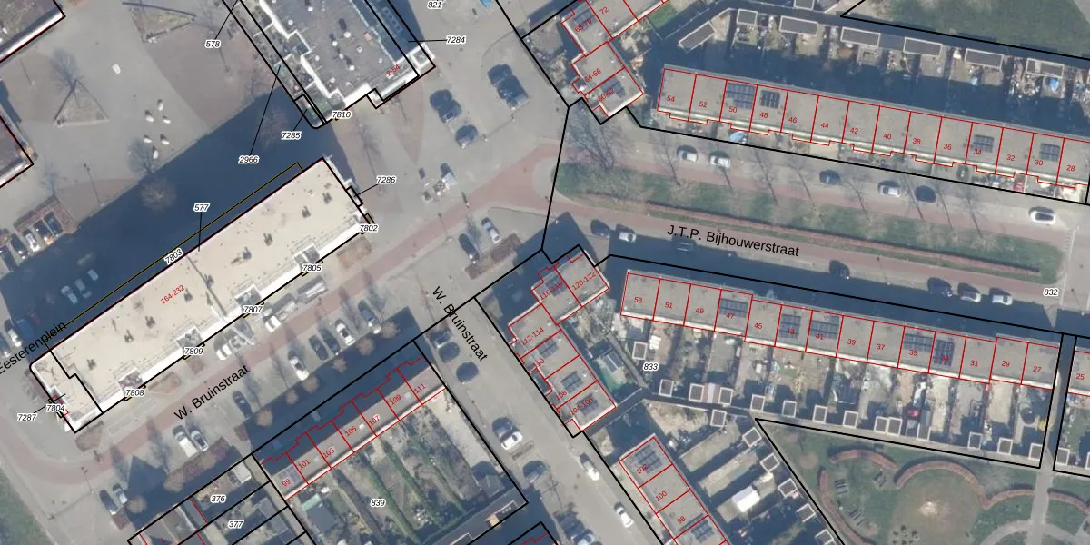 Het perceel waarop W. Bruinstraat 116 staat heeft een oppervlakte van 4110 m². Dit is een zeer groot perceel. De perceeloppervlakte wordt geregistreerd door het Kadaster. Gedetailleerde informatie over de maten van dit perceel kunt u vinden in het rapport Kadastrale kaart met maatvoering van W. Bruinstraat 116.