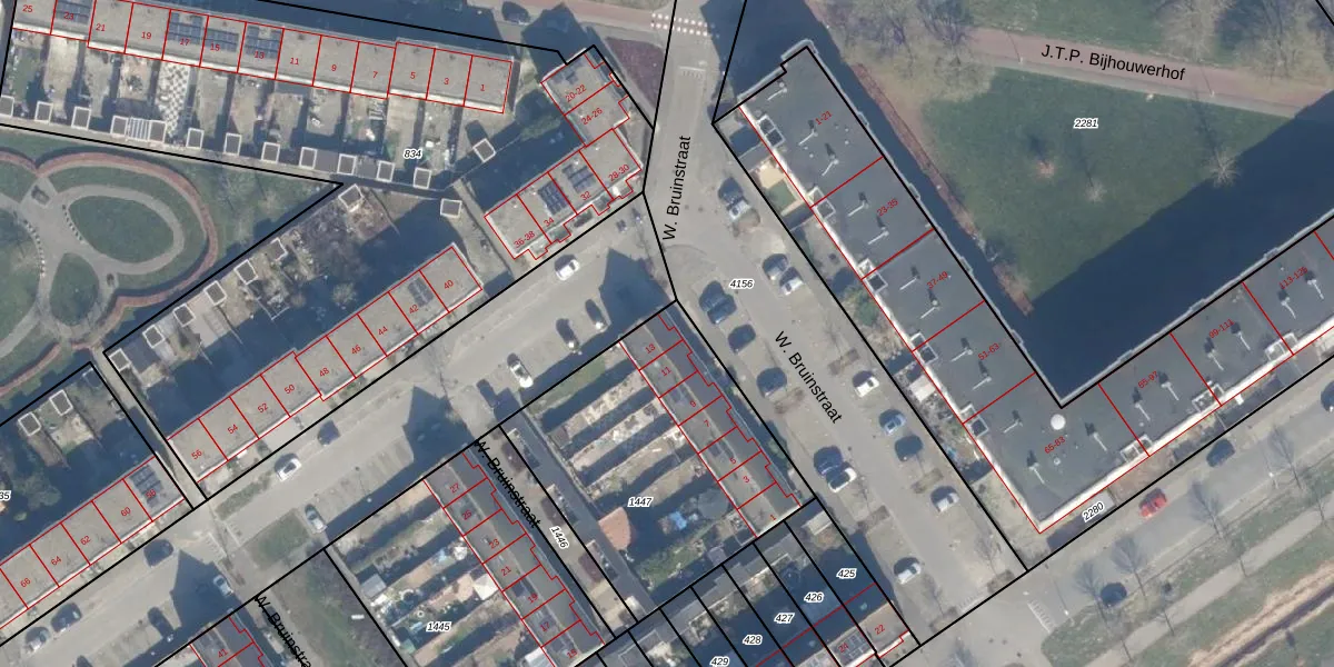 Het perceel waarop W. Bruinstraat 13 staat heeft een oppervlakte van 1184 m². Dit is een zeer groot perceel. De perceeloppervlakte wordt geregistreerd door het Kadaster. Gedetailleerde informatie over de maten van dit perceel kunt u vinden in het rapport Kadastrale kaart met maatvoering van W. Bruinstraat 13.