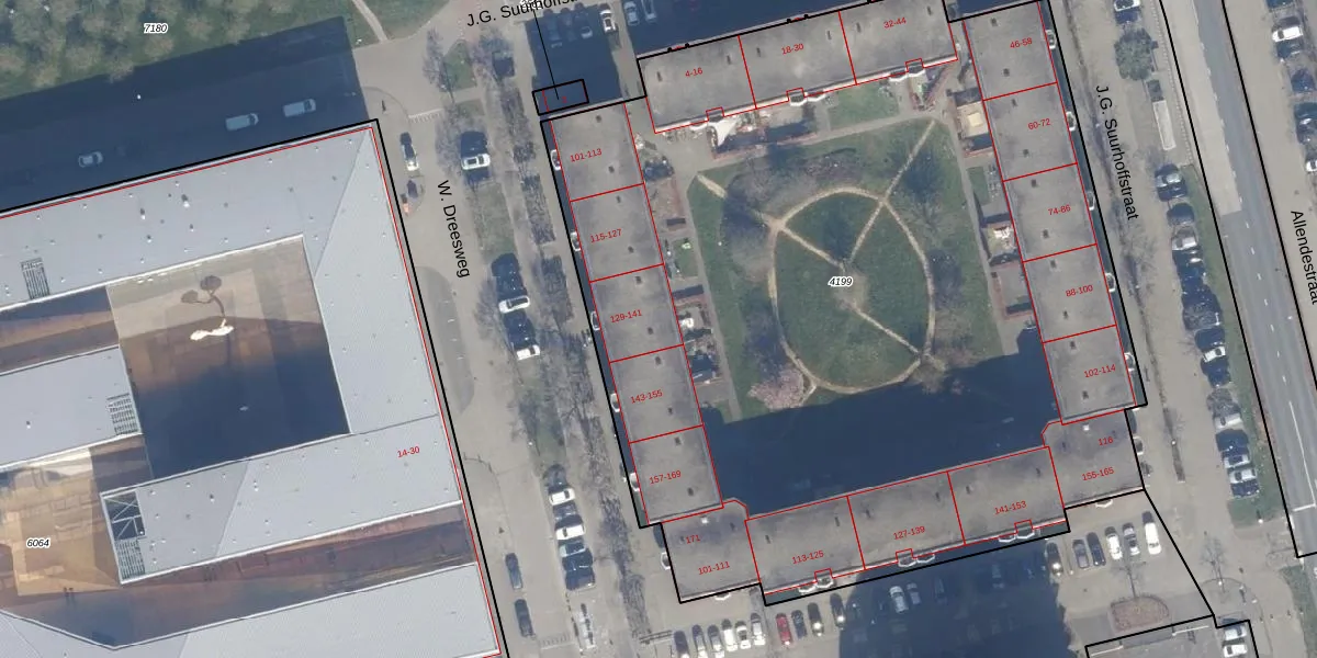 Het perceel waarop W. Dreesweg 141 staat heeft een oppervlakte van 6382 m². Dit is een zeer groot perceel. De perceeloppervlakte wordt geregistreerd door het Kadaster. Gedetailleerde informatie over de maten van dit perceel kunt u vinden in het rapport Kadastrale kaart met maatvoering van W. Dreesweg 141.