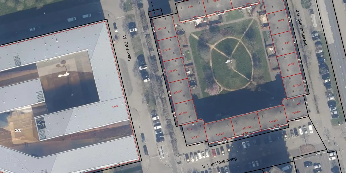 Het perceel waarop W. Dreesweg 143 staat heeft een oppervlakte van 6382 m². Dit is een zeer groot perceel. De perceeloppervlakte wordt geregistreerd door het Kadaster. Gedetailleerde informatie over de maten van dit perceel kunt u vinden in het rapport Kadastrale kaart met maatvoering van W. Dreesweg 143.