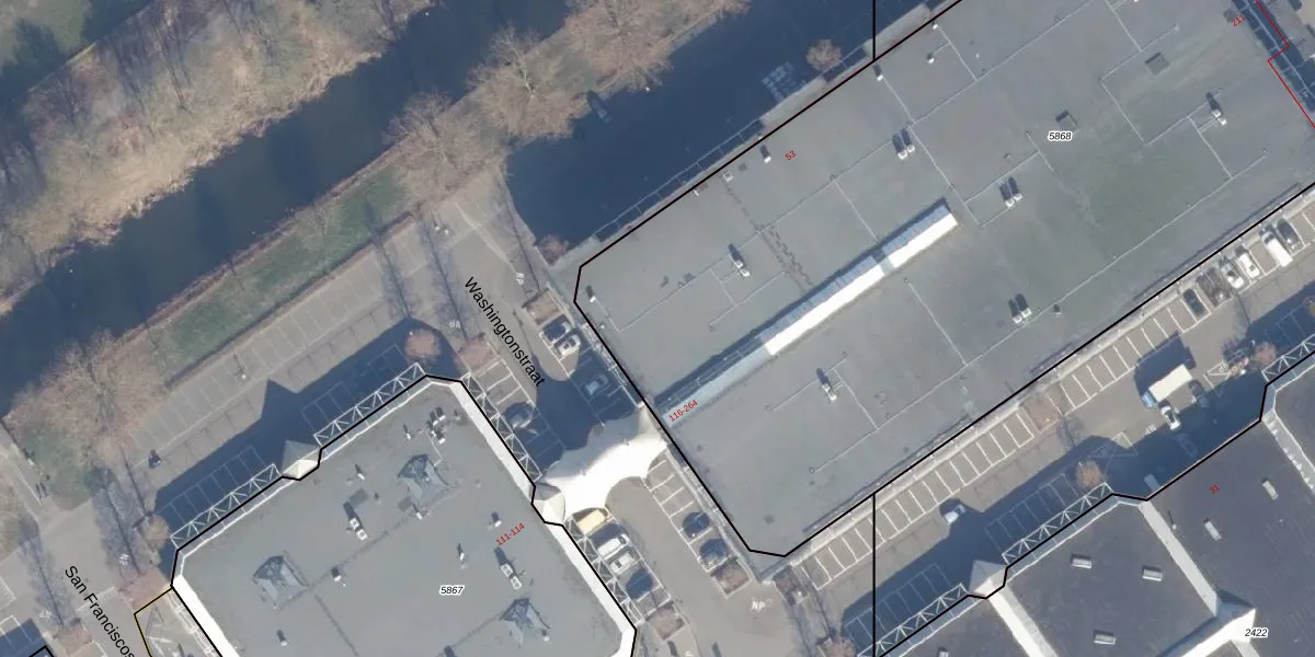 Het perceel waarop Washingtonstraat 264 staat heeft een oppervlakte van 6940 m². Dit is een zeer groot perceel. De perceeloppervlakte wordt geregistreerd door het Kadaster. Gedetailleerde informatie over de maten van dit perceel kunt u vinden in het rapport Kadastrale kaart met maatvoering van Washingtonstraat 264.