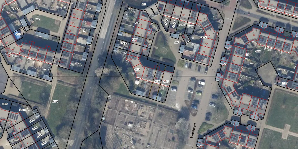 Het perceel waarop Wittewerf 51 staat heeft een oppervlakte van 635 m². Dit is een groot perceel. De perceeloppervlakte wordt geregistreerd door het Kadaster. Gedetailleerde informatie over de maten van dit perceel kunt u vinden in het rapport Kadastrale kaart met maatvoering van Wittewerf 51.