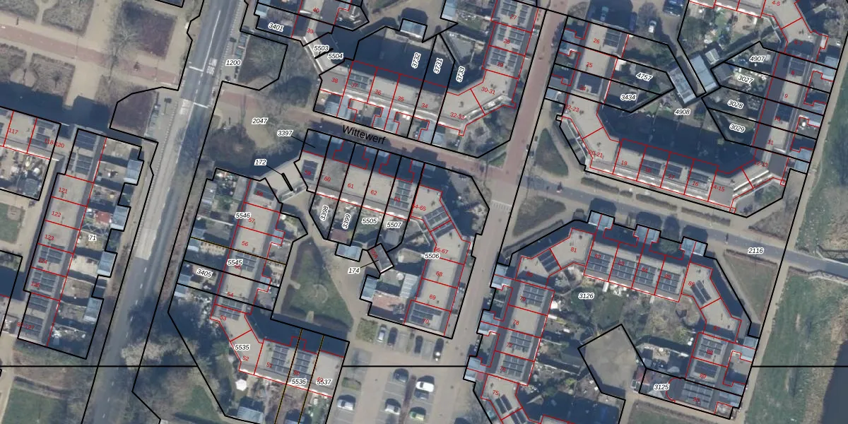 Het perceel waarop Wittewerf 65 staat heeft een oppervlakte van 705 m². Dit is een groot perceel. De perceeloppervlakte wordt geregistreerd door het Kadaster. Gedetailleerde informatie over de maten van dit perceel kunt u vinden in het rapport Kadastrale kaart met maatvoering van Wittewerf 65.