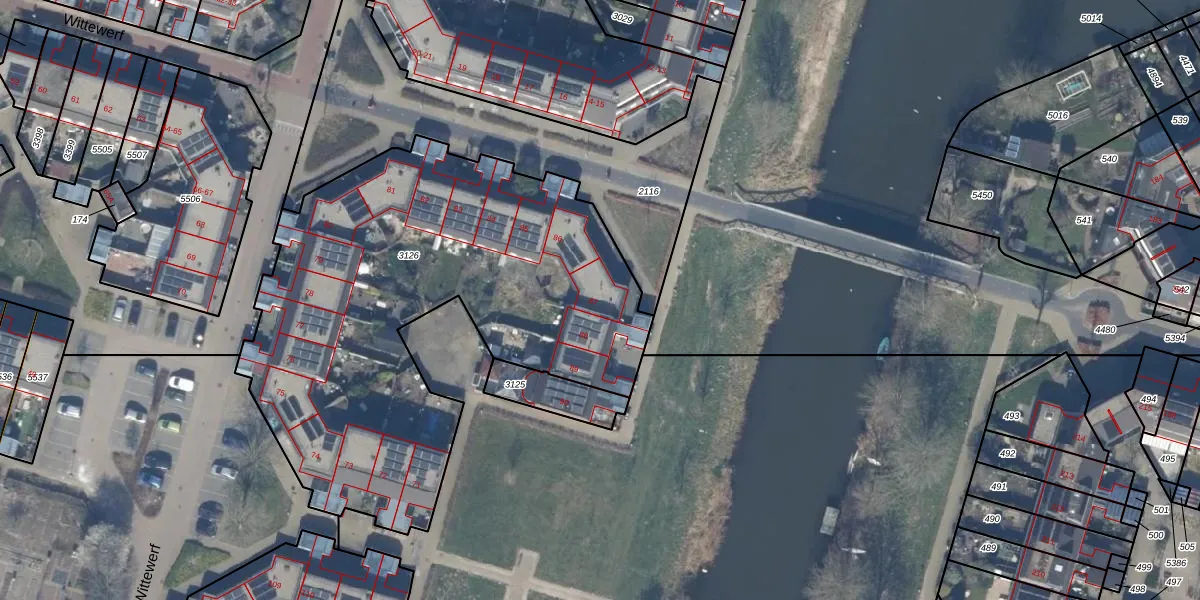Het perceel waarop Wittewerf 87 staat heeft een oppervlakte van 2582 m². Dit is een zeer groot perceel. De perceeloppervlakte wordt geregistreerd door het Kadaster. Gedetailleerde informatie over de maten van dit perceel kunt u vinden in het rapport Kadastrale kaart met maatvoering van Wittewerf 87.