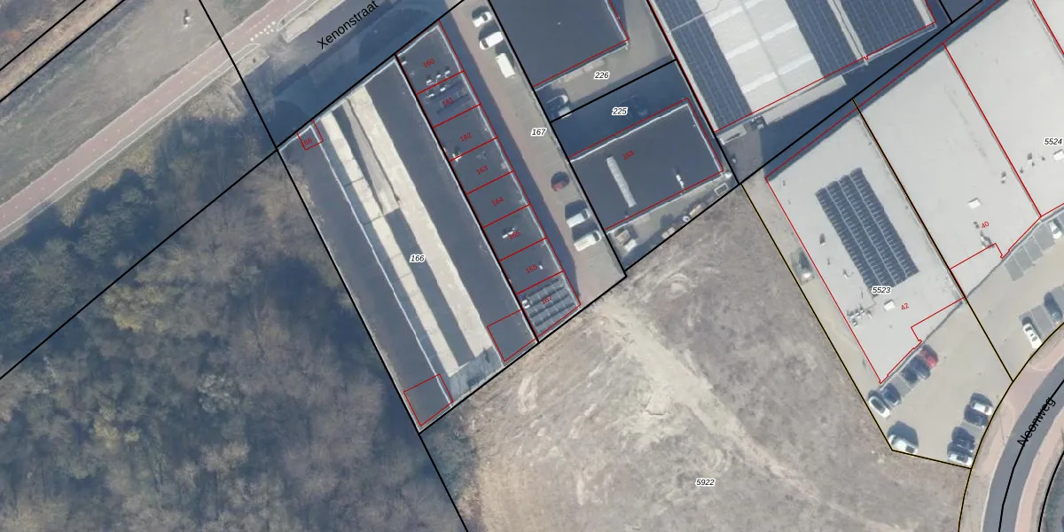 Het perceel waarop Xenonstraat 166 staat heeft een oppervlakte van 1236 m². Dit is een zeer groot perceel. De perceeloppervlakte wordt geregistreerd door het Kadaster. Gedetailleerde informatie over de maten van dit perceel kunt u vinden in het rapport Kadastrale kaart met maatvoering van Xenonstraat 166.