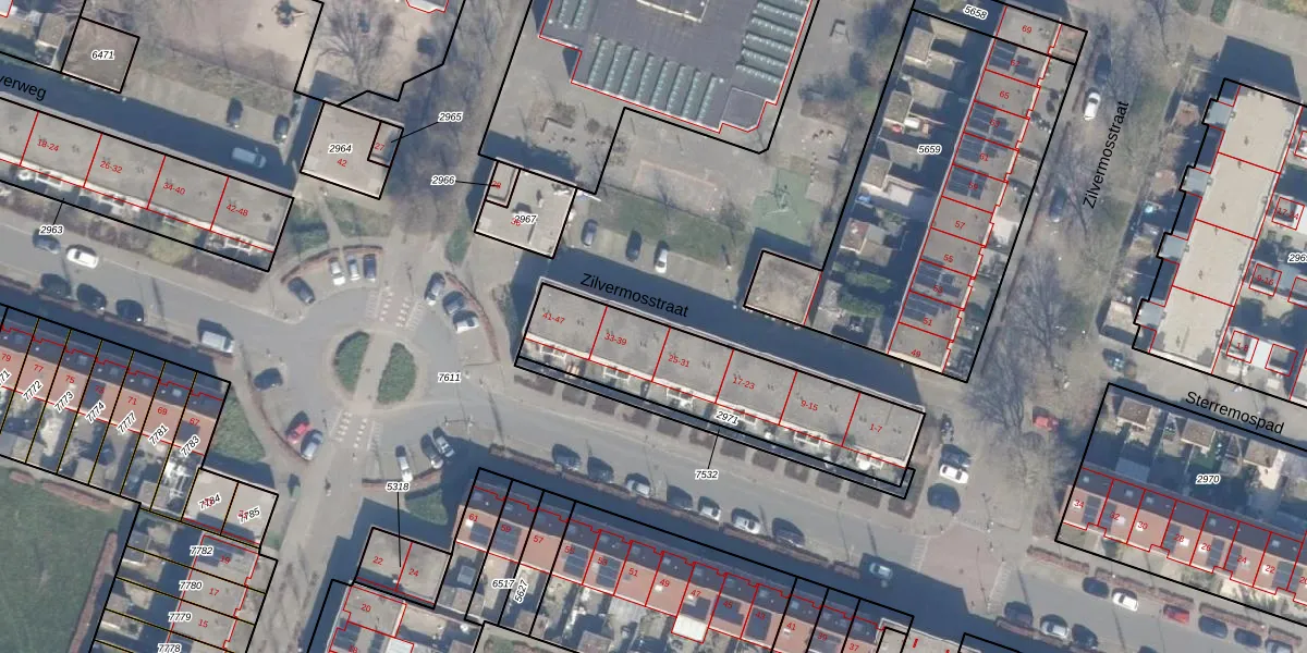 Het perceel waarop Zilvermosstraat 33 staat heeft een oppervlakte van 731 m². Dit is een groot perceel. De perceeloppervlakte wordt geregistreerd door het Kadaster. Gedetailleerde informatie over de maten van dit perceel kunt u vinden in het rapport Kadastrale kaart met maatvoering van Zilvermosstraat 33.
