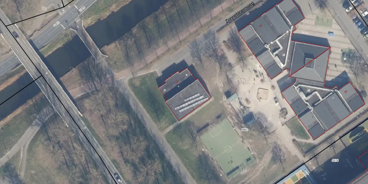 Het perceel waarop Zonnebloemweg 64 staat heeft een oppervlakte van 2,8 ha. Dit is een zeer groot perceel. De perceeloppervlakte wordt geregistreerd door het Kadaster. Gedetailleerde informatie over de maten van dit perceel kunt u vinden in het rapport Kadastrale kaart met maatvoering van Zonnebloemweg 64.