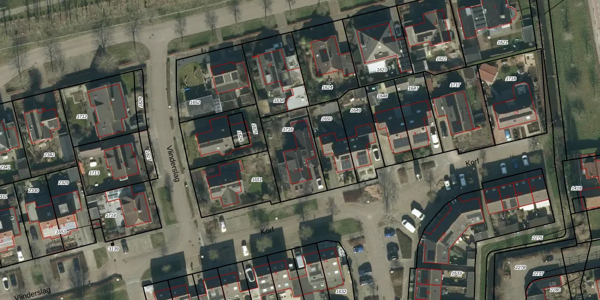 Het perceel waarop Korf 1 staat heeft een oppervlakte van 470 m². Dit is een groot perceel. De perceeloppervlakte wordt geregistreerd door het Kadaster. Gedetailleerde informatie over de maten van dit perceel kunt u vinden in het rapport Kadastrale kaart met maatvoering van Korf 1.