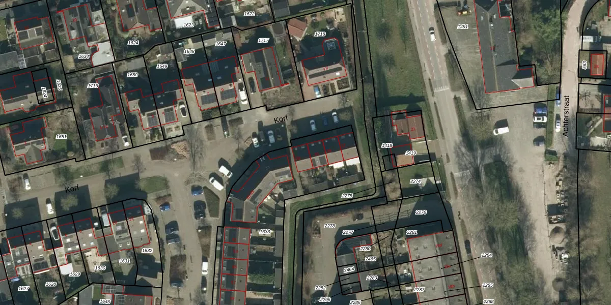 Het perceel waarop Korf 33 staat heeft een oppervlakte van 1543 m². Dit is een zeer groot perceel. De perceeloppervlakte wordt geregistreerd door het Kadaster. Gedetailleerde informatie over de maten van dit perceel kunt u vinden in het rapport Kadastrale kaart met maatvoering van Korf 33.