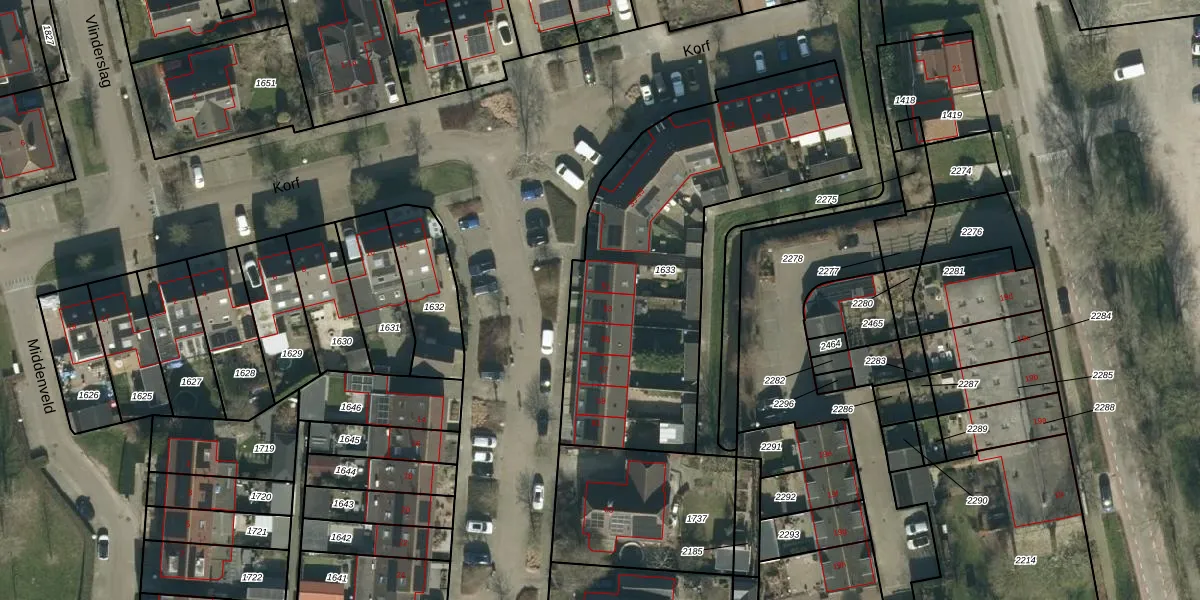 Het perceel waarop Korf 53 staat heeft een oppervlakte van 1543 m². Dit is een zeer groot perceel. De perceeloppervlakte wordt geregistreerd door het Kadaster. Gedetailleerde informatie over de maten van dit perceel kunt u vinden in het rapport Kadastrale kaart met maatvoering van Korf 53.