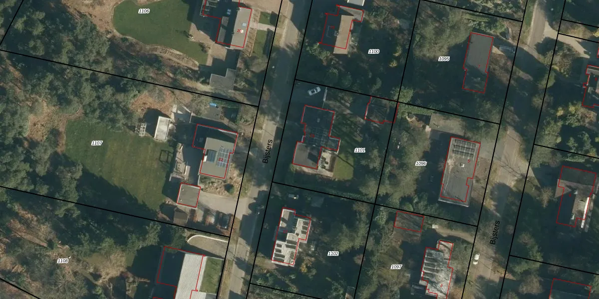 Het perceel waarop Bijsters 15 staat heeft een oppervlakte van 1225 m². Dit is een zeer groot perceel. De perceeloppervlakte wordt geregistreerd door het Kadaster. Gedetailleerde informatie over de maten van dit perceel kunt u vinden in het rapport Kadastrale kaart met maatvoering van Bijsters 15.