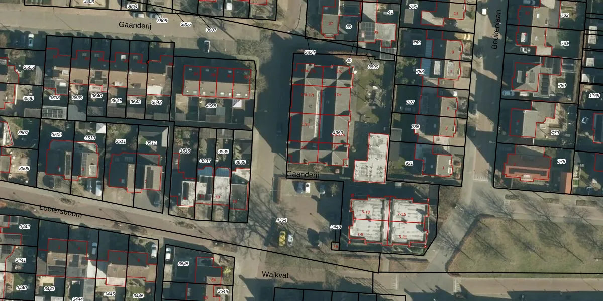 Het perceel waarop Gaanderij 17-i staat heeft een oppervlakte van 2150 m². Dit is een zeer groot perceel. De perceeloppervlakte wordt geregistreerd door het Kadaster. Gedetailleerde informatie over de maten van dit perceel kunt u vinden in het rapport Kadastrale kaart met maatvoering van Gaanderij 17-i.