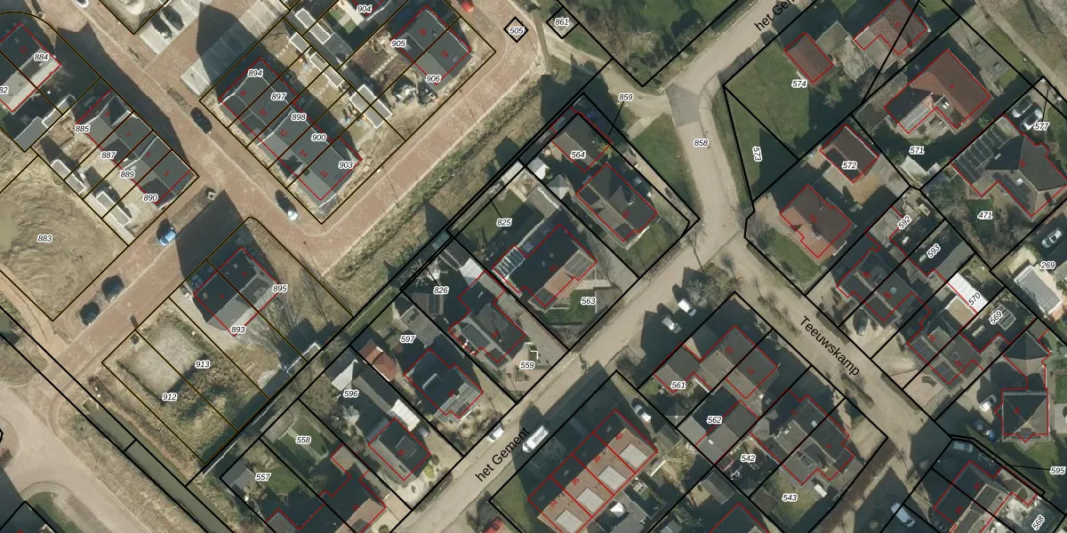 Het perceel waarop het Gement 41 staat heeft een oppervlakte van 570 m². Dit is een groot perceel. De perceeloppervlakte wordt geregistreerd door het Kadaster. Gedetailleerde informatie over de maten van dit perceel kunt u vinden in het rapport Kadastrale kaart met maatvoering van het Gement 41.