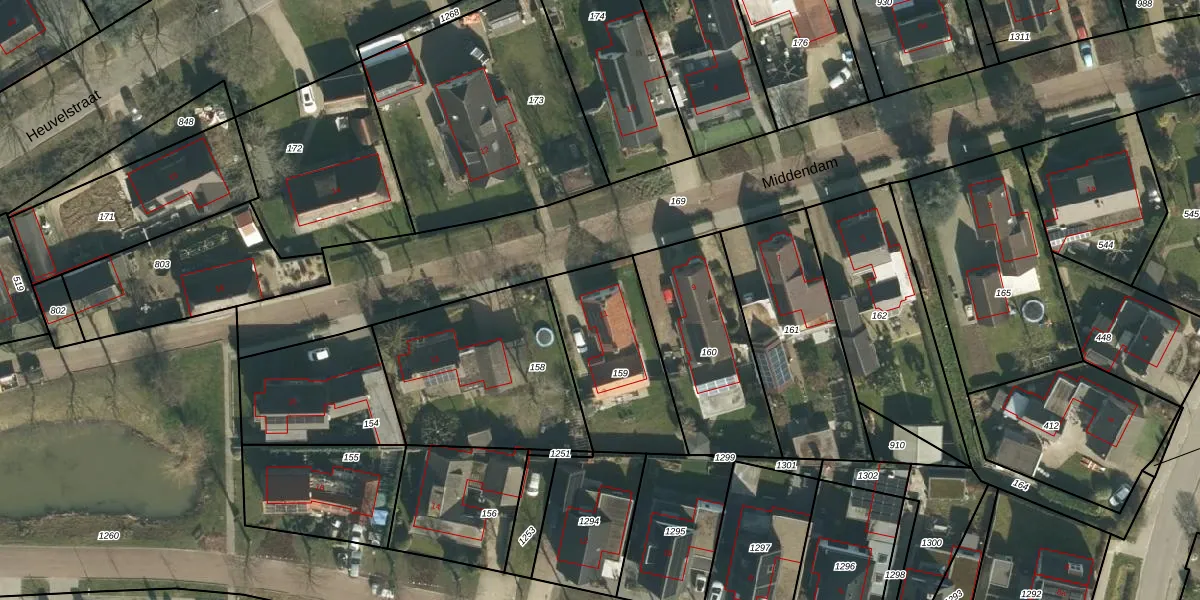 Het perceel waarop Middendam 11 staat heeft een oppervlakte van 477 m². Dit is een groot perceel. De perceeloppervlakte wordt geregistreerd door het Kadaster. Gedetailleerde informatie over de maten van dit perceel kunt u vinden in het rapport Kadastrale kaart met maatvoering van Middendam 11.