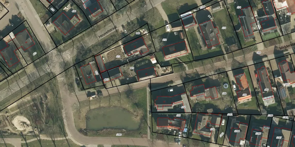 Het perceel waarop Middendam 16 staat heeft een oppervlakte van 530 m². Dit is een groot perceel. De perceeloppervlakte wordt geregistreerd door het Kadaster. Gedetailleerde informatie over de maten van dit perceel kunt u vinden in het rapport Kadastrale kaart met maatvoering van Middendam 16.