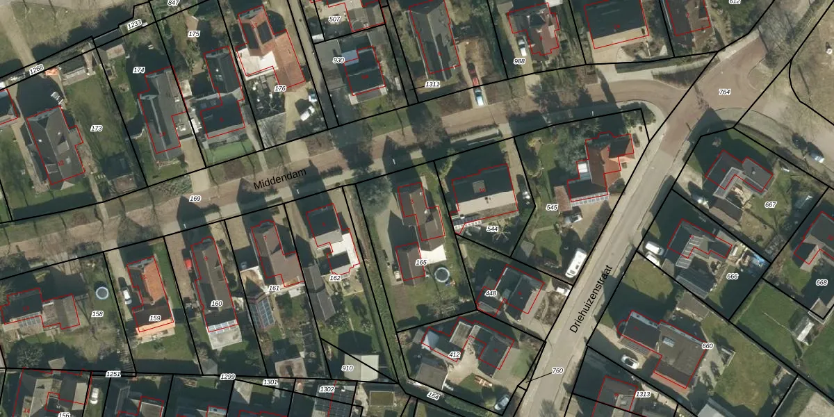 Het perceel waarop Middendam 3 staat heeft een oppervlakte van 740 m². Dit is een groot perceel. De perceeloppervlakte wordt geregistreerd door het Kadaster. Gedetailleerde informatie over de maten van dit perceel kunt u vinden in het rapport Kadastrale kaart met maatvoering van Middendam 3.