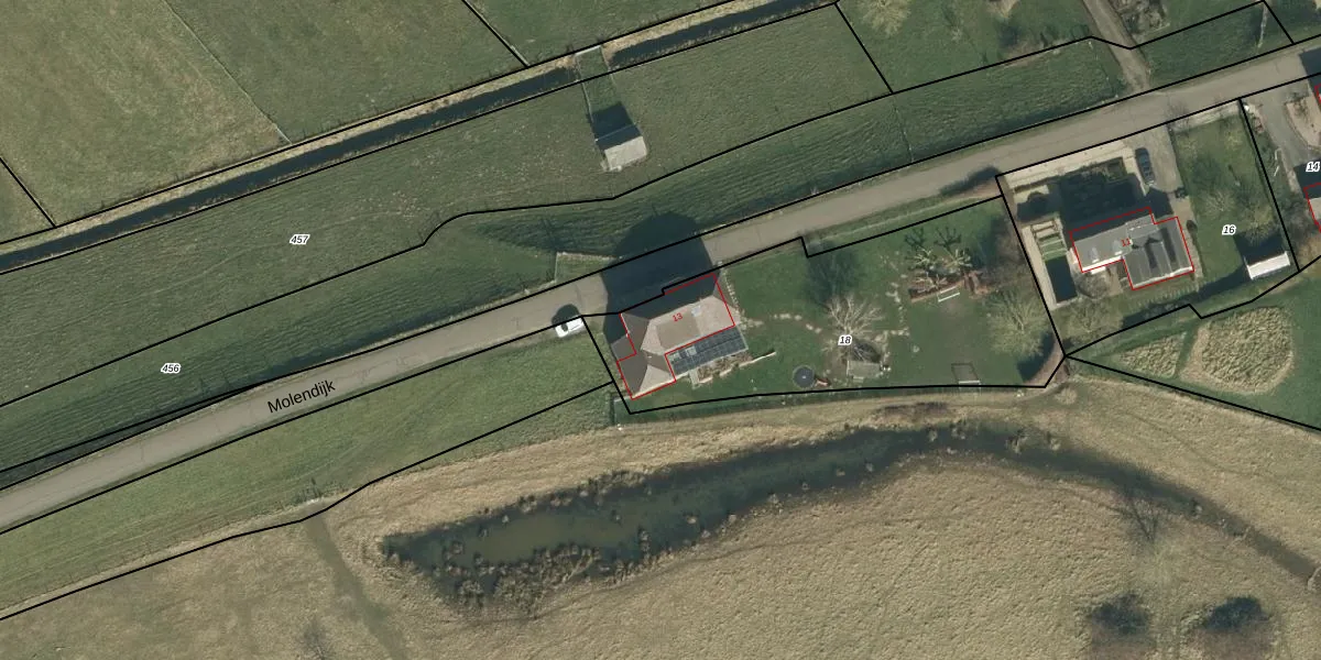 Het perceel waarop Molendijk 13 staat heeft een oppervlakte van 1500 m². Dit is een zeer groot perceel. De perceeloppervlakte wordt geregistreerd door het Kadaster. Gedetailleerde informatie over de maten van dit perceel kunt u vinden in het rapport Kadastrale kaart met maatvoering van Molendijk 13.