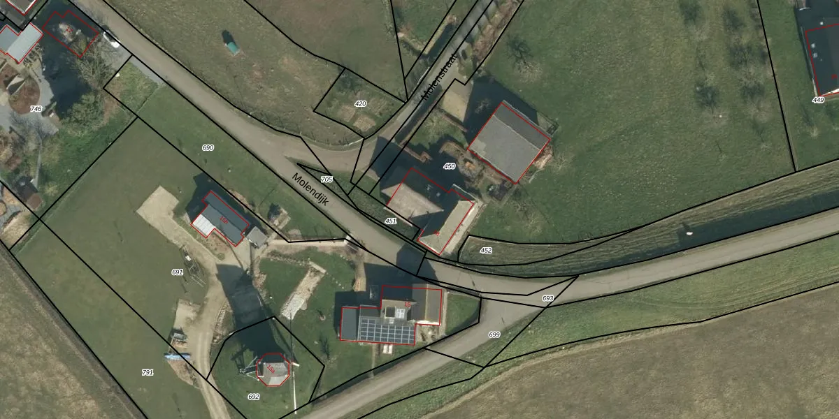 Het perceel waarop Molendijk 18 staat heeft een oppervlakte van 5910 m². Dit is een zeer groot perceel. De perceeloppervlakte wordt geregistreerd door het Kadaster. Gedetailleerde informatie over de maten van dit perceel kunt u vinden in het rapport Kadastrale kaart met maatvoering van Molendijk 18.